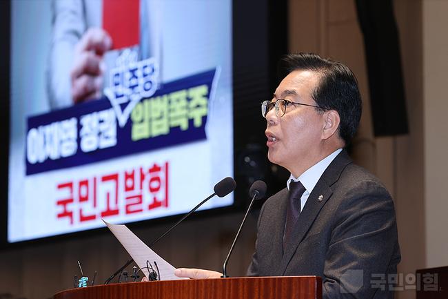 송언석 원내대표는 “오늘 우리는 당내 의원님과 외부 전문가들을 모시고 이재명 정권 독재악법 국민고발회를 갖게 되었다”며 “더불어민주당에서는 정기국회 마지막 날인 내일 이런 악법들을 본회의에 전부 상정해 대한민국 헌정 기본 질서를 허물어뜨리는 이 법들을 강행 처리하겠다고 예고하고 있다”고 말했다. 그는 “그 악법들의 문제점들을 국민들께 낱낱이 알려드리기 위해서 오늘 이 자리를 마련했다”고 밝혔다.