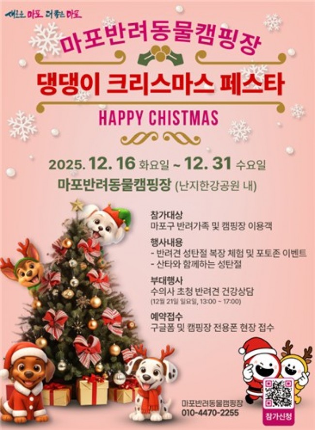 "메리 크리스마스" 마포구가 준비한 댕댕이 크리스마스 페스타마포구(구청장 박강수)는 연말을 맞아 2025년 12월 16일부터 12월 31일까지 난지한강공원 내 마포반려동물캠핑장에서 반려동물과 특별한 연말 추억을 만들 수 있는 `댕댕이 크리스마스 페스타`를 개최한다.