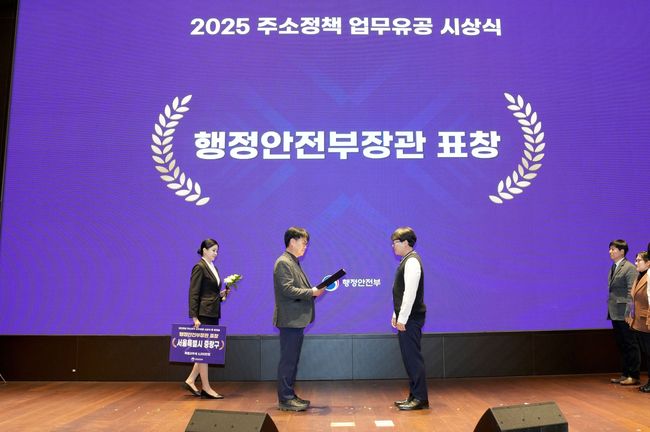 중랑구, `2025년 주소 정책 업무 유공` 평가 서울시 유일 우수기관 선정.24일 중랑구(구청장 류경기)는 행정안전부가 주관한 ‘2025년 주소 정책 업무 유공’ 평가에서 서울시 자치구 가운데 유일하게 우수기관으로 선정돼 행정안전부 장관 표창을 수상하고, 특별교부세 4,000만 원을 확보했다고 밝혔다.