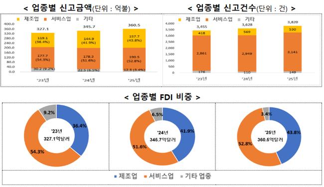 산업통상자원부는 2025년 연간 외국인직접투자 신고액이 전년 대비 4.3% 증가한 360.5억 달러로 역대 최대를 기록했고, 자금 도착액도 179.5억 달러로 16.3% 늘었다고 밝혔다.