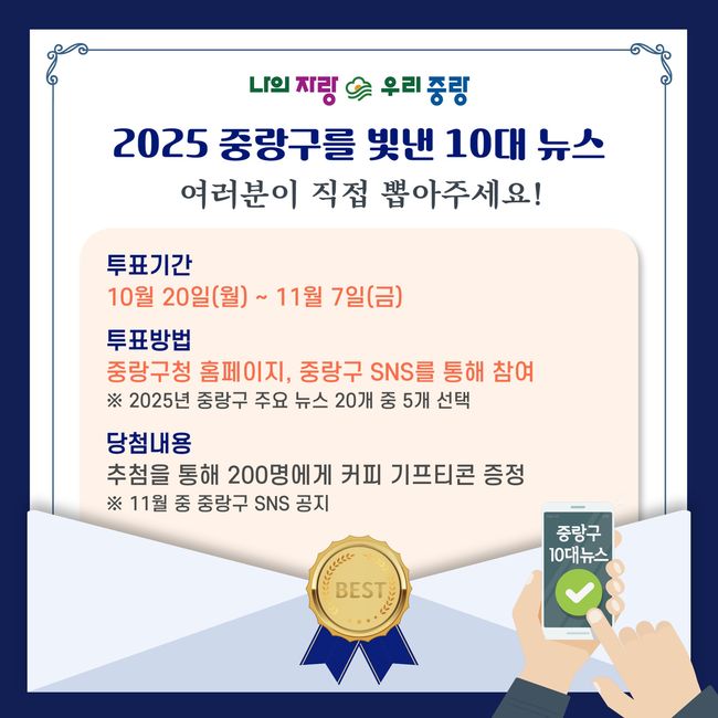 투표는 중랑구청 누리집과 공식 SNS를 통해 누구나 참여할 수 있으며, 참여자 중 이벤트에 동의한 200명을 무작위로 선정해 1만 원 상당의 기프티콘을 증정한다. 당첨자는 11월 중 중랑구 공식 SNS를 통해 공개될 예정이다.