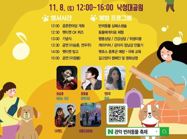 구는 식전 행사로 `펫티켓 OX 퀴즈`를 열어 참가자들과 반려동물 예절을 익히며 축제 분위기를 끌어올릴 예정이다. 이후 본 무대에서는 이정봉, 이승훈, 연우주 등 초대 가수의 다채로운 공연이 이어진다.