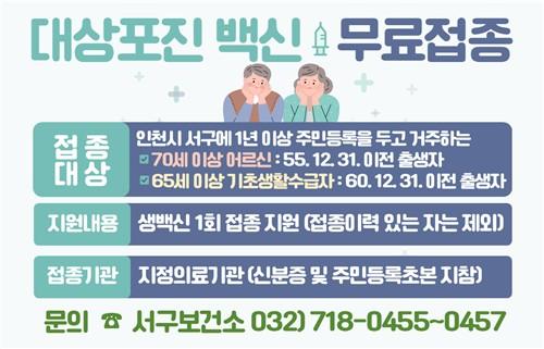 인천 서구(구청장 강범석)는 구민의 면역력 향상과 질병 부담 감소를 위해 대상포진 예방접종을 무료로 연중 실시하고 있다.