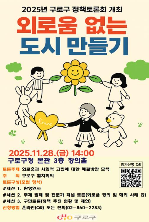 2025년 구로구 정책토론회 `외로움 없는 도시 만들기` 홍보 포스터.구로구는 11월 28일 구청 본관 3층 창의홀에서 ‘외로움 없는 도시 만들기’를 주제로 정책토론회를 개최한다고 밝혔다. 이번 행사는 오후 2시부터 4시까지 진행된다.