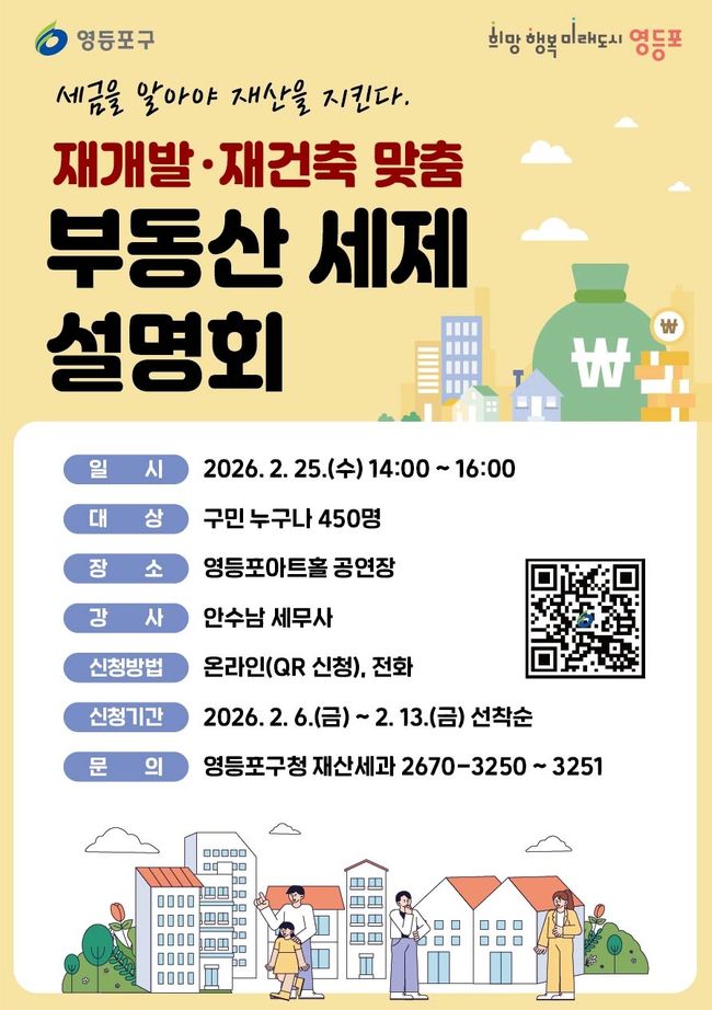 설명회는 영등포구민이라면 누구나 신청할 수 있으며, 2월 6일부터 13일까지 선착순으로 450명을 모집한다. 신청은 영등포구청 누리집 ‘우리구소식’ 게시판을 통한 온라인 접수 또는 구청 재산세과 전화 신청으로 가능하다.