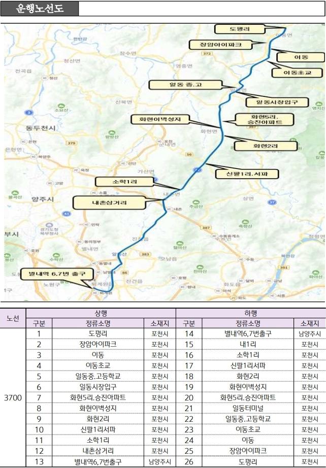 포천시, 3700번(도평리-별내역) 광역버스 3월 4일 운행 개시