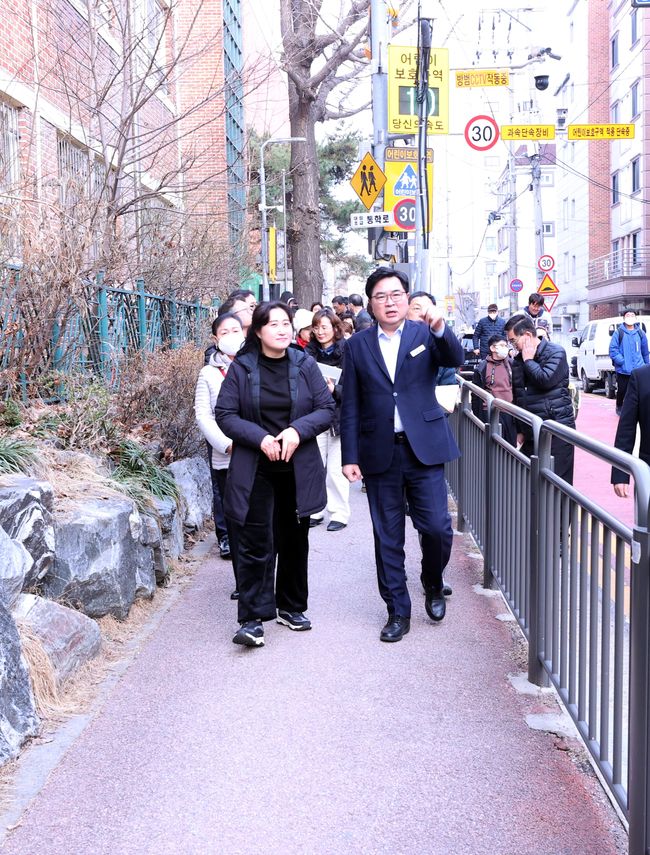 지난해 2월, 박일하 동작구청장이 서울 동작구 대방동 대림초등학교 통학로 안전을 점검하고 있다.동작구(구청장 박일하)는 최근 아동 대상 범죄 시도가 늘어나면서 학부모 불안이 높아진 가운데, 스마트 기술을 활용한 안전망 구축을 위해 ‘동작 아이 안전 앱’ 지원사업을 시행한다고 밝혔다.