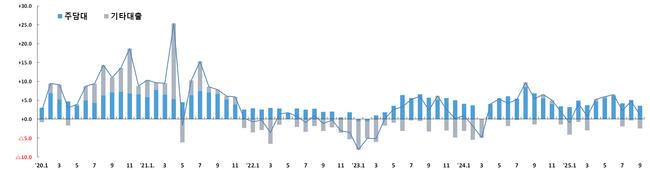 2025년 9월 한 달 동안 전 금융권 가계대출이 1조1천억 원 증가하는 데 그치며 전월(4조7천억 원) 대비 4분의 1 수준으로 급감한 것으로 나타났다. 정부의 6·27 부동산 대책 효과가 시차를 두고 본격화하면서 주택담보대출 증가폭이 줄고, 신용대출 중심의 기타대출이 큰 폭 감소한 영향으로 분석된다.