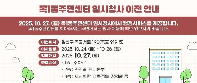 양천구, 목1동 주민센터 임시청사로 이전...10월 27일 업무 개시