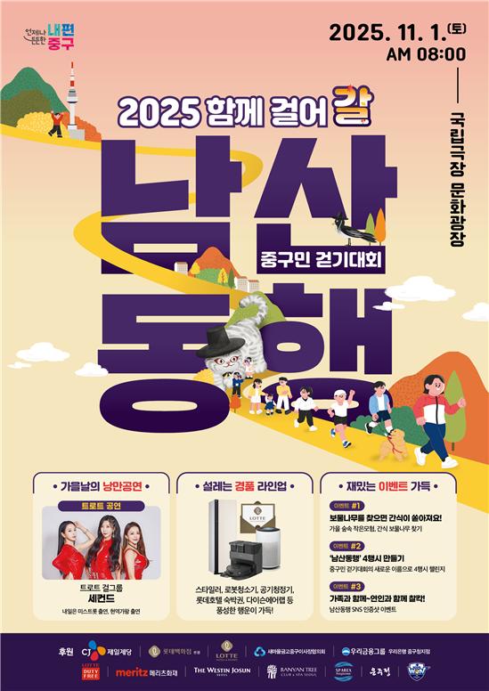 남산동행 걷기대회 홍보 포스터.서울 중구(구청장 김길성)는 오는 11월 1일 오전 8시 국립극장에서 ‘중구민 걷기대회 남산동행’을 연다고 27일 밝혔다. 이번 행사는 구민이 함께 남산의 가을을 즐기며 건강과 소통을 다지는 걷기 축제로 마련됐다.
