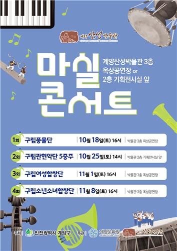 인천광역시 계양구(윤환 구청장)는 10월 18일부터 11월 8일까지 매주 토요일 계양산성박물관에서 열리는 가을 문화행사 `마실콘서트`가 깊어가는 가을 정취 속에 구민들의 큰 호응을 얻으며 진행 중이라고 밝혔다.