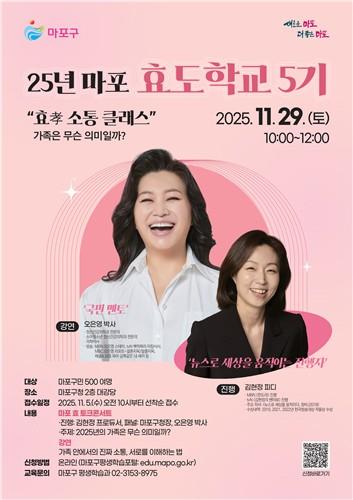 `마포 효도학교 5기`로 진행되는 `효(孝) 소통 클래스`는 가족의 의미를 재조명하고 세대 간 마음을 잇는 따뜻한 소통의 장으로, 11월 29일 오전 10시 마포구청 대강당에서 열린다.