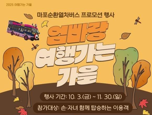 마포구(구청장 박강수)가 후원하고 마포구시설관리공단이 주최, 주관하는 마포순환열차버스 프로모션 행사 `엄빠랑 여행가는 가을`이 11월 30일까지 운영된다.