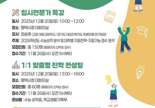 프로그램 사전 신청은 오는 11월 26일 오전 9시부터 `평택시 대학입시설명회` 누리집으로 참여할 수 있다.