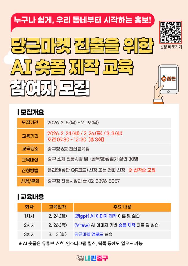 서울 중구가 전통시장과 골목형상점가 상인의 온라인 홍보 역량 강화를 위해 ‘당근마켓 AI 숏폼 제작 교육’을 운영한다.