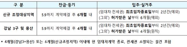 기존 조정대상지역 중 서울 강남·서초·송파·용산구 소재 주택은 5월 9일 이전 계약을 체결하고 계약일로부터 4개월 이내에 잔금을 치르면 중과가 적용되지 않는다. 토지거래허가 대상 주택의 경우 허가일로부터 4개월 내 입주 의무가 유지된다.