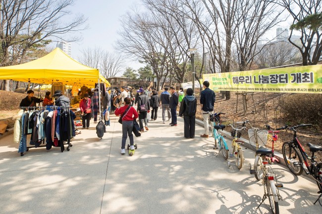 `해우리 나눔장터`는 가정에서 사용하지 않는 의류, 도서, 완구 등 중고 물품을 구민이 직접 판매·교환하며 자원 재사용을 실천하는 주민 참여형 장터로, 중고 물품을 판매하기 위해서는 사전 신청을 통해 자리를 배정받아야 한다.