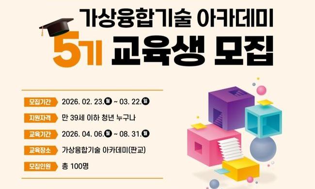 과학기술정보통신부는 차세대 가상 융합 산업을 선도할 청년 인재를 양성하기 위해 ‘가상 융합기술 아카데미’ 제5기 교육생을 3월 22일까지 공개 모집한다고 밝혔다. 모집 대상은 만 18세 이상 39세 이하 청년으로, 총 100명을 선발한다.